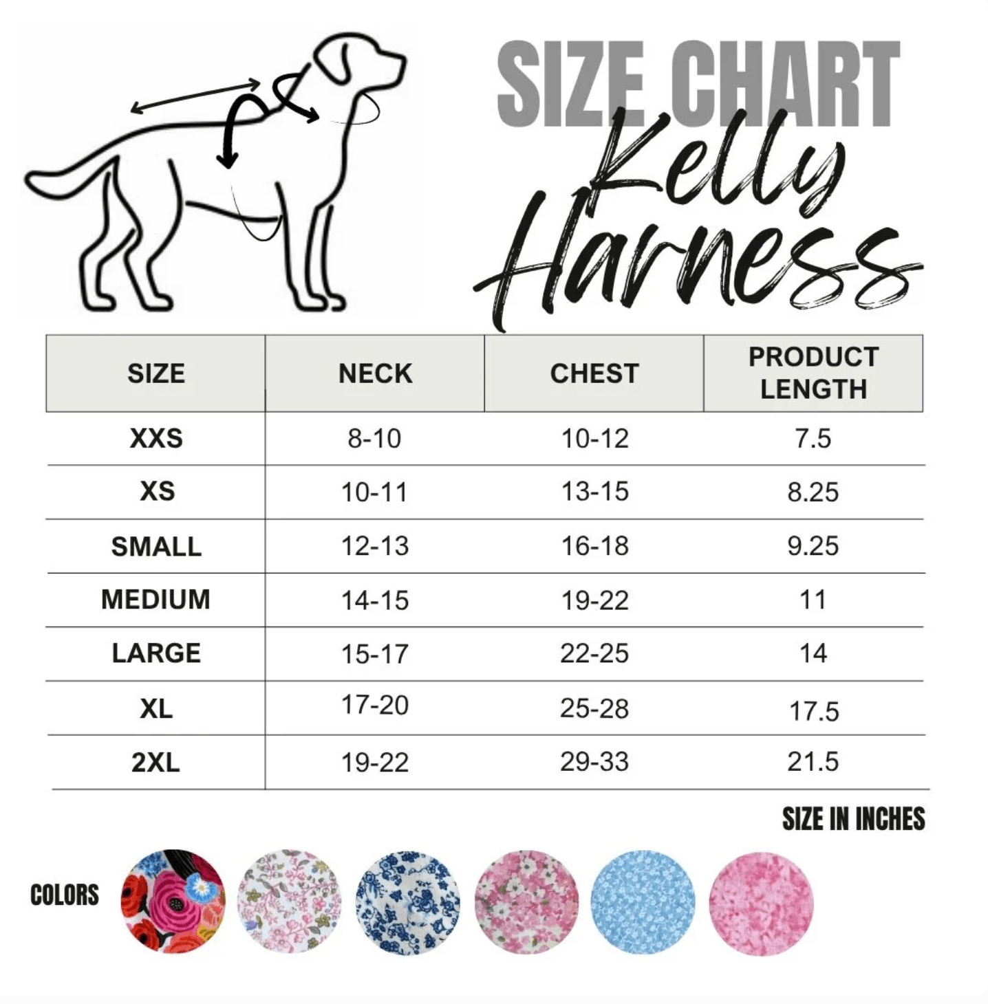 Our size charts guide you with measurements of your pet's neck, chest, and waist. You a string to mark and measure your pet's measurements.