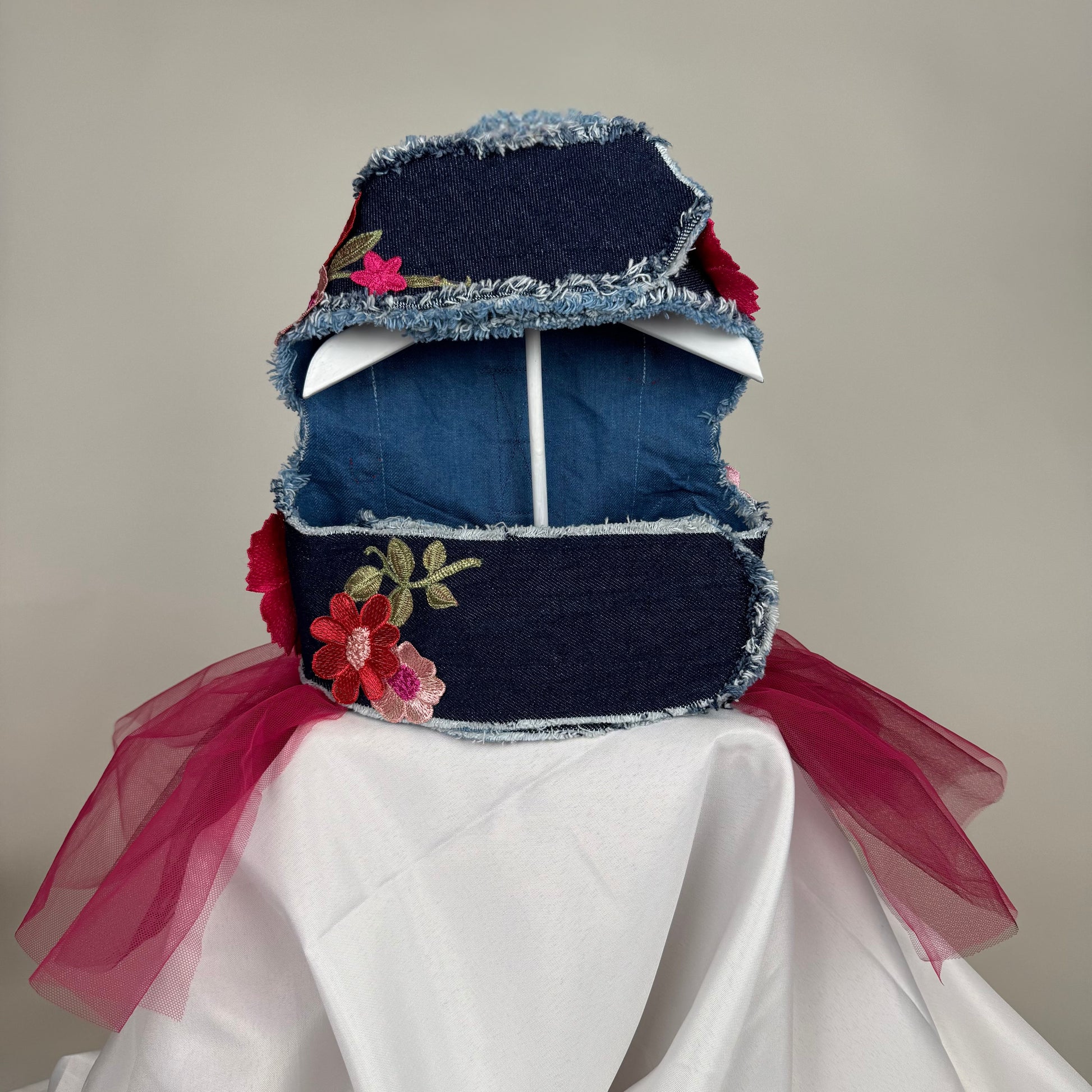 This charming dress combines style with practicality for your pup's special occasions. Featuring delicate flower appliques and soft, layered tulle in a radiant raspberry sorbet palette, it's perfect for photos and celebrations. The functional denim harness includes a D-ring for secure leash attachment and fastens with reliable hook and loop closures. An upcycled denim pocket adds character. Please note that denim tones may vary slightly from piece to piece, making each dress uniquely your own. Available in five other colors for every celebration.