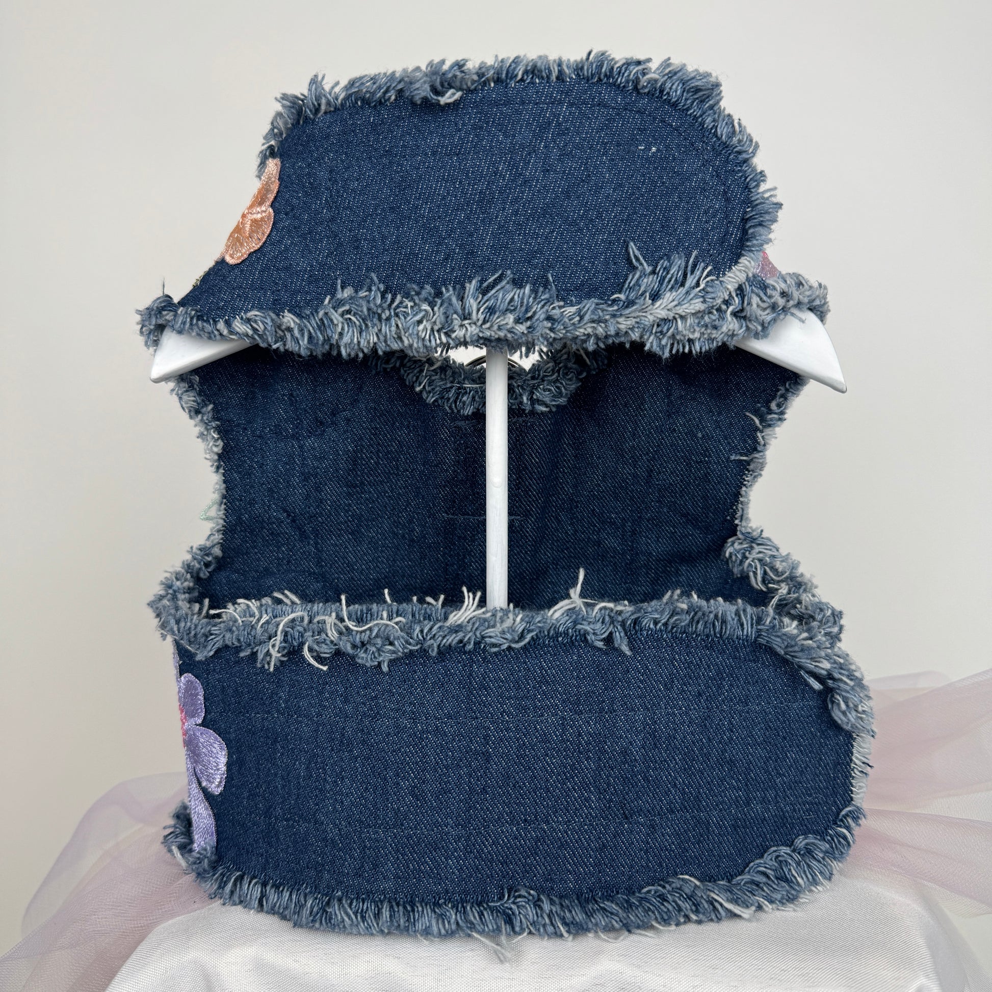 This charming dress combines style with practicality for your pup's special occasions. Featuring delicate flower appliques and soft, layered tulle in a perfect ube buttercream palette, it's perfect for photos and celebrations. The functional denim harness includes a D-ring for secure leash attachment and fastens with reliable hook and loop closures. An upcycled denim pocket adds character. Please note that denim tones may vary slightly from piece to piece, making each dress uniquely your own. Available in five other colors for every celebration.